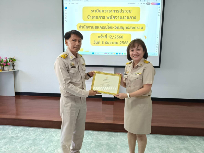 วันที่ 8 ธันวาคม 2568 นายมงคล เกิดสินธุ์ สหกรณ์จังหวัดสมุทรสงคราม เป็นประธานในการประชุมข้าราชการ พนักงานราชการ สำนักงานสหกรณ์จังหวัดสมุทรสงคราม ครั้งที่ 12/2568 ประจำเดือนธันวาคม 2568 โดยมีบุคลากรสำนักงานสหกรณ์จังหวัด เข้าร่วมประชุม เพื่อสรุปผลการปฏิบัติงานตามแผนงาน/โครงการและงบประมาณประจำปี พ.ศ. 2569 พร้อมทั้งร่วมแสดงความยินดีและมอบประกาศเกียรติคุณให้แก่ นางสาวรัตนาพร เสมทับ ที่ได้รับการยกย่องเชิดชูเกียรติให้เป็นผู้ตรวจการสหกรณ์ดีเด่น ประจำปี พ.ศ. 2568 (ระดับหน่วยงาน) ณ ห้องประชุมสำนักงานสหกรณ์จังหวัดสมุทรสงคราม